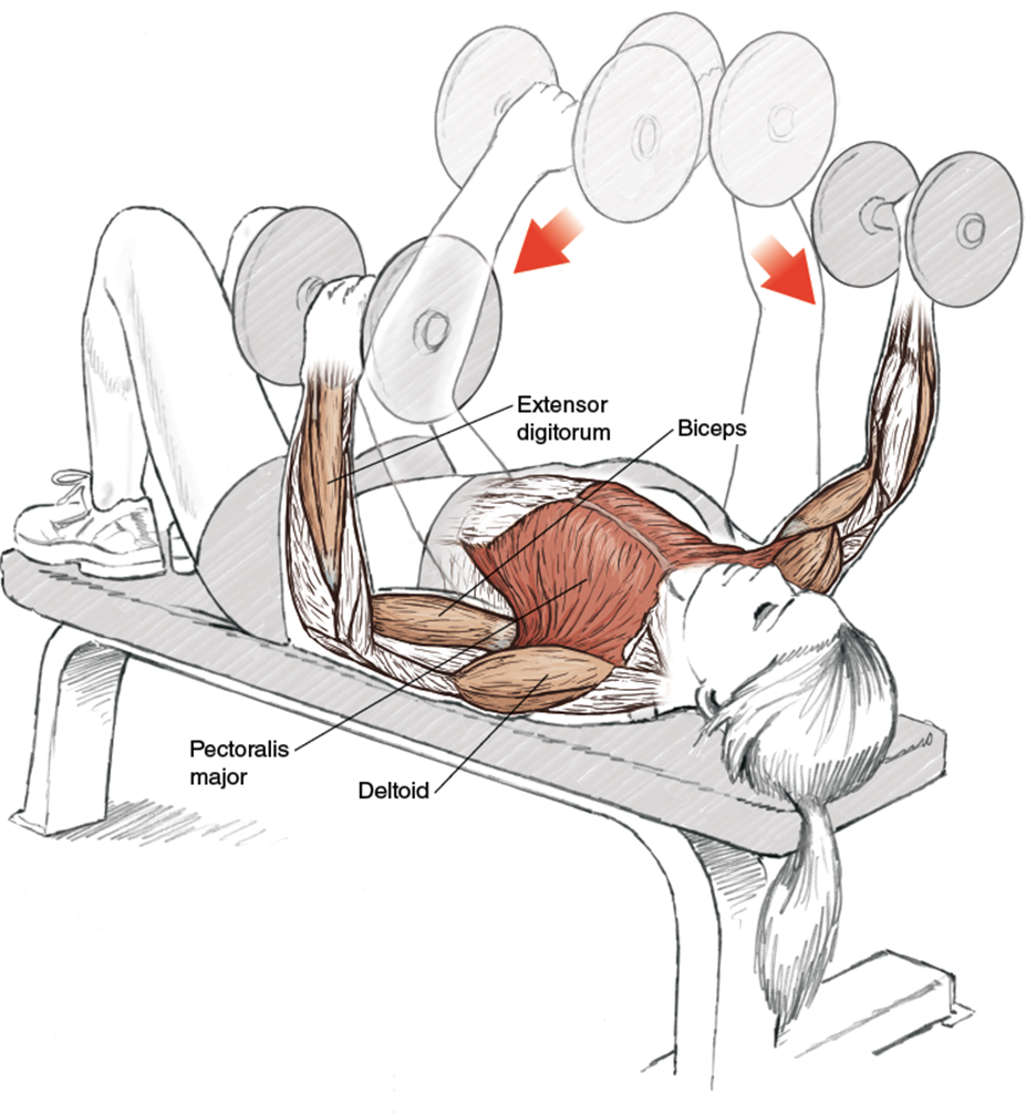 As mentioned earlier in the chapter, the muscles of the chest become fatigued by exercise in exactly the same way as do all other muscles, so developing these muscles through a simple exercise like the dumbbell press is both easy and beneficial. This exercise recruits the abdominal group more than the barbell bench press because the torso requires stabilization as a result of the independence of each dumbbell. It targets the pectoral muscle group and uses the abdominal group as stabilizers. The stronger the abdominal and pectoral group are, the better the posture of a distance runner in the latter stages of a race or training run, as well as the cardiovascular benefit of improved respiration. The better the upper-body posture of a runner, the more efficient the gait cycle is, aiding the runner by not wasting precious energy on poor running mechanics.