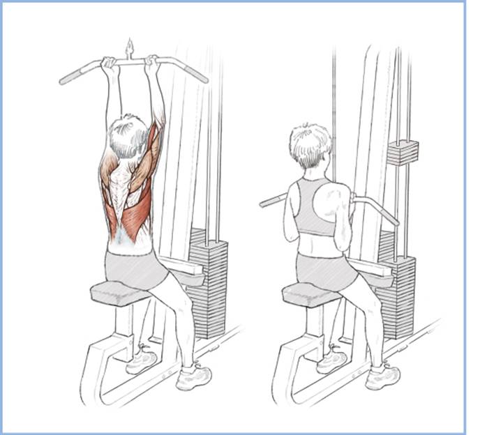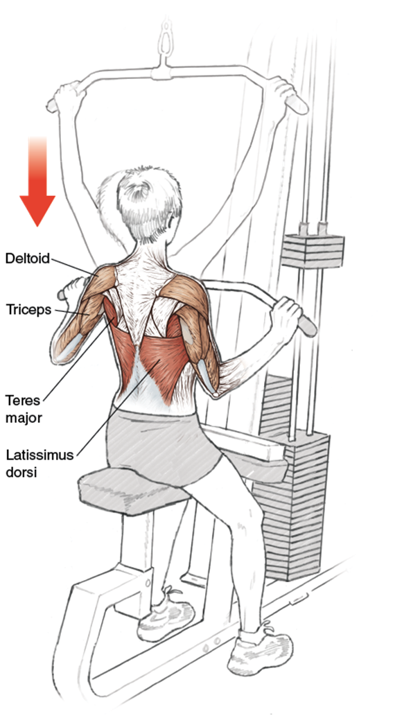 • The lat pull-down will cause significant muscle mass to develop in the upper back if heavy weight is used as resistance. It is recommended to perform the exercise with lighter weight than the maximum and to complete multiple sets of higher repetitions.