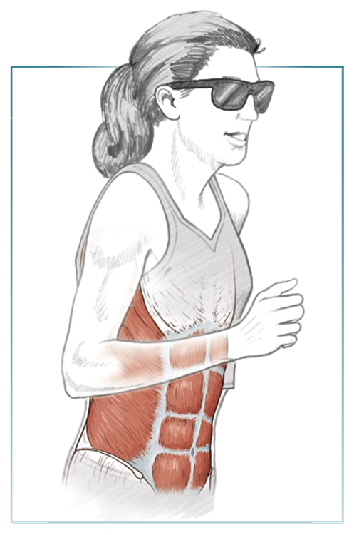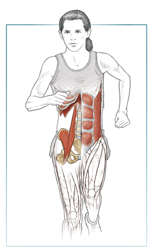 Returning to the pelvis and its adjacent organs, the abdomen, unlike the chest, does not have a bony architecture to stabilize it. The vertical height is maintained by the lumbar vertebrae. The responsibility for stability falls to the abdominal contents, which exert a counterpressure to a surrounding circular wall of muscles formed by the rectus abdominis, which extends from the base of the rib cage centrally down to the pubic symphysis and bone (figure 7.3). Outside this and lying diagonally are the external and internal oblique and the transversus abdominis muscles, which have three functions: to abduct and rotate the trunk, to flex the lumbar and lower thoracic vertebrae forward, and to contain the abdomen. When running, these muscles alternately lengthen and shorten as the pelvis moves not only from side to side, but also twists, rises, and falls relative to the surrounding body parts. In addition, they have a function to aid respiration at high rates, working in conjunction with the diaphragm and ribs, which is particularly noticeable if the runner is reduced to panting. Thus, they have multiple roles, all of which may be required at the same time, and will perform better if well and thoroughly trained.