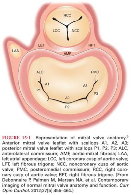 The mitral valve apparatus consists of an orifice with an annulus, anterior and posterior leaflets, many chordae tendineae, and two papillary muscles. The anterior and posterior leaflets converge at the anterolateral and posteromedial commissures, each of which is associated with a papillary muscle. The anterior leaflet is semicircular and occupies one-third of the circumference, whereas the posterior leaflet is elongated and narrow and is attached to the remaining two-thirds of the annulus. The posterior leaflet is divided into three parts based on the presence of two indentations: a lateral P1, a central P2, and a medial P3 scallop. The segments of anterior leaflet opposing the posterior leaflet are similarly designated as A1, A2, and A3 scallop (Fig. 15-1).5