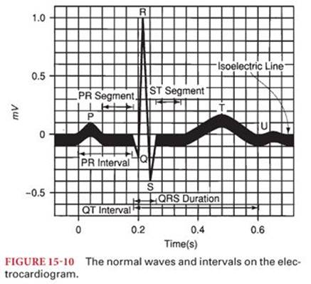 The standard limb leads, named I, II, and III, record the potential difference between two points of the body (Fig. 15-5). In lead I, the electrodes are placed on the left shoulder (positive) and right shoulder (negative). In lead II, the positive electrode is on the left leg and the negative is on the right shoulder. In lead III, the positive electrode is on the left leg and the negative on the left arm. The limb leads form the triangle of Einthoven, which is used together with the augmented limb leads to calculate the electrical axis of the heart in the frontal axis. The direction of the depolarization of the atria parallels lead II, resulting in a prominent P wave in this lead.