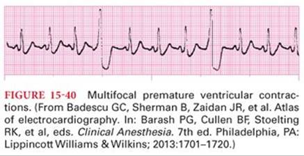 Premature ventricular contractions often reflect significant cardiac disease. For example, myocardial ischemia may be responsible for initiation of premature ventricular contractions from an irritable site in poorly oxygenated ventricular muscle. Other causes include valvular heart disease, high-catecholamine state, hypoxia, hypercapnia, cocaine, alcohol, caffeine, electrolyte abnormalities, and medications. Treatment of premature ventricular contractions includes removal of trigger factors, β blockers, calcium channel blockers, lidocaine, amiodarone, and radiofrequency ablation depending on the symptoms.