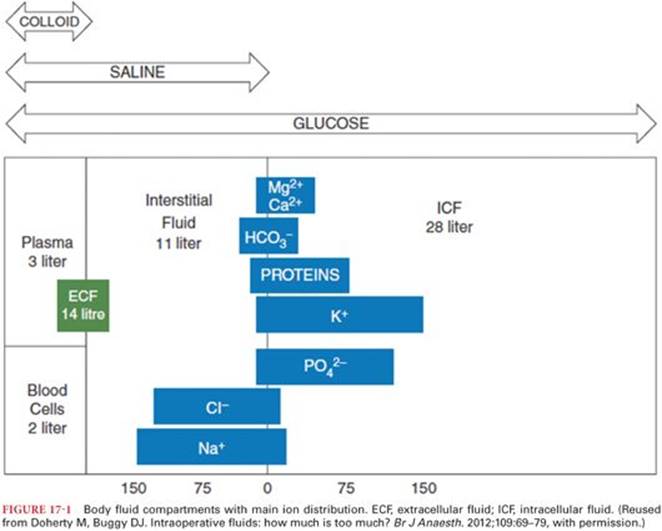 The adult body is composed of approximately 60% water, with some variation with age and gender, as well as significant variation among different tissues. For example, muscle is about 75% water, whereas adipose tissue only 10%. About two-thirds of total body fluid is intracellular and one-third extracellular (Fig. 17-1). The intracellular compartment is rich in potassium (the major cation), magnesium, calcium, phosphate (the major anion), and proteins. Extracellular volume (ECV) includes interstitial fluids (about 80% of the ECV), plasma (about 20%), and transcellular fluids, which are anatomically separate fluid spaces, such as the intraocular, gastrointestinal, and cerebrospinal fluids, and are not available for water and solute exchange with the remainder of the ECV. Extracellular fluids are rich in sodium (the major cation) and chloride (the major anion). These and other small ions move freely between plasma and interstitium in the extracellular compartment. The plasma also contains proteins, such as albumin and globulins, which create the colloid oncotic pressure. Plasma proteins are prevented from freely moving from vascular to interstitial space by the interplay of the vascular endothelial cells and the endothelial glycocalyx layer (EGL) coating the inside of the vascular space. Macromolecule movement out of the vascular space is dependent on the type of EGL pores and endothelial cell junctions, which have four phenotypes throughout the body. In the liver, spleen, and marrow, sinusoidal capillaries have large EGL pores and open fenestrations allowing macromolecules to pass between plasma and the interstitial space. The glomeruli have open capillary fenestrations with the effective pore size reduced by overlying EGL. Endocrine, choroid plexus, and gut mucosa vascular endothelial cells have inducible fenestrations. Nerve, muscle, connective tissue, and lung have nonfenestrated or continuous capillaries so that little transvascular filtration into the interstitium occurs in these tissues. In states of inflammation, changes in the endothelial cells and an increase in the number of large pores in the capillaries increase the amount of protein passing from vascular into interstitial spaces. The transcapillary escape rate of albumin to tissues is normally 5% per hour but can double during surgery and increase to 20% in sepsis.1 Fluid in the interstitial space is returned to the circulation as lymph.2 The cell membrane prevents sodium, the primary extracellular cation, from moving into the cell, except for a small amount by active pump transport, but isotonic fluids containing sodium added to the vascular space are distributed throughout the ECV so that only 20% of the volume infused remains in the plasma.3