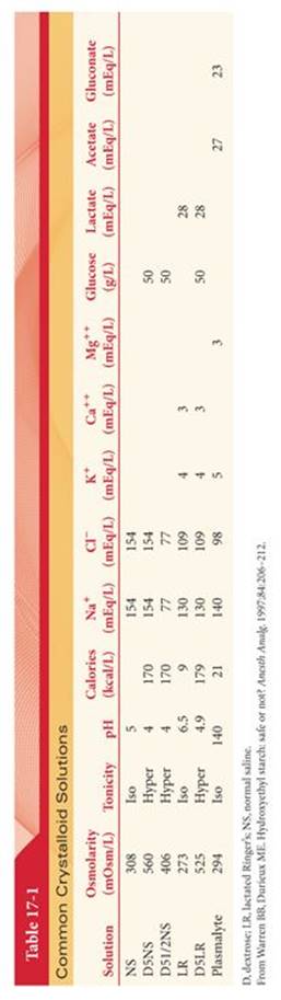 Crystalloids are fluid solutions containing ion salts and other low-molecular-weight substances. Crystalloids can be categorized based on their tonicity or osmotic pressure of the solution with respect to that of plasma. Examples are listed in Table 17-1. Administering large volumes of normal saline (NS) can result in hyperchloremic metabolic acidosis.4 “Balanced” or “physiologic” crystalloid solutions contain a composition approximating that of extracellular fluid but are usually slightly hypotonic because of lower sodium concentration. Administering large volumes of balanced salt solutions can result in hyperlactatemia, metabolic alkalosis, hypotonicity, and cardiotoxicity due to acetate. Calcium-containing balanced salt solution may cause formation of microthrombi when infused with citrate-containing banked blood.