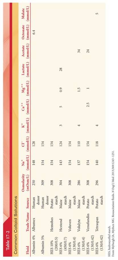Colloid solutions contain macromolecules suspended in electrolyte solutions. These macromolecules, such as plant or animal polysaccharides or polypeptides, remain in the plasma compartment longer than crystalloid solutions; however, their distribution has been shown to be context sensitive, with larger percentages of the volume administered remaining intravascular in hypovolemic patients as compared to normovolemic patients.3 Semisynthetic colloid solutions are metabolized and excreted and thus have a shorter duration of effect than human albumin solutions.2 Examples are listed in Table 17-2.
