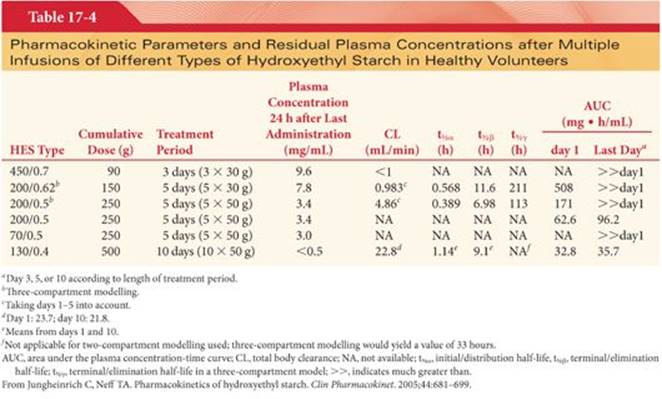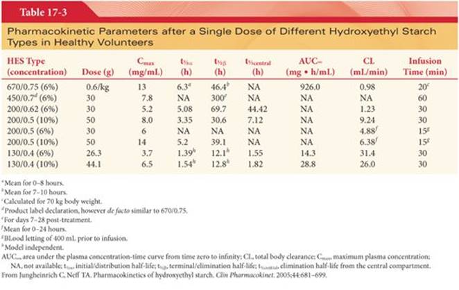 Renal excretion of HES occurs in two phases: immediate glomerular filtration of HES polymers less than 59 kDa and delayed glomerular filtration after HES metabolism by plasma α-amylase. This amylase functions as an endoamylase cleaving within the polyglucose chain instead of acting at the ends of the molecule, resulting in polydispersity and varying molecular weights of the remaining HES molecules in the plasma. Thus, pharmacokinetic parameters of plasma clearance and half-life will change over time, cannot be rigorously defined, and must not be interpreted as efficacy half-lives or contributing to the pharmacodynamics of volume effect of HES solutions.11Additionally, the hydroxyethyl groups retard hydrolysis of the compound by amylases, allowing longer presence in the plasma. Plasma levels of amylase are elevated after HES administration for 72 hours, without evidence of increased pancreatic production, owing to decreased renal elimination of amylase as it remains complexed to HES.5 The pharmacokinetic profile of some HES solutions after single dose and multiple infusions in healthy volunteers is described in Tables 17-311 and 17-4,11 and in impaired renal function in Table 17-5.12