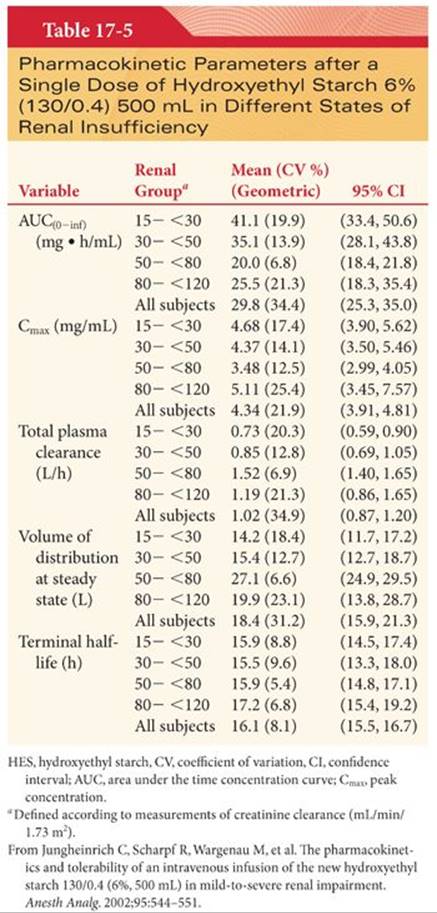 12. Jungheinrich C, Scharpf R, Wargenau M, et al. The pharmacokinetics and tolerability of an intravenous infusion of the new hydroxyethyl starch 130/0.4 (6%, 500 mL) in mild-to-severe renal impairment. Anesth Analg. 2002;95:544–551.