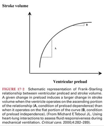 Fluid responsiveness may be defined as a 15% increase in cardiac output following a 500-mL IV fluid bolus, indicating that the patient is still on the ascending limb of the cardiac output/end diastolic volume curve, also referred to as the cardiac function curve17 (Fig. 17-2). Fluid administration to a patient on the plateau part of the curve may be of little benefit and result in adverse effects. Filling pressure measures, particularly central venous pressure, correlate poorly with blood volume, and changes in central venous pressure have been shown to poorly predict hemodynamic response to fluid challenge.18Stroke volume changes due to increases or decreases in right ventricular preload may be used to assess fluid responsiveness. Positive pressure ventilation decreases right ventricular stroke volume by decreasing venous return to the right heart and increasing right ventricular afterload. The decrease in right ventricular stroke volume is passed on to the left ventricle over subsequent cardiac cycles and if the left ventricle is preload dependent, decreases in the left ventricle stroke volume will cause a decrease in the arterial pulse pressure. These cyclic changes associated with positive airway pressure are greater when the ventricles are functioning on the steep, ascending portion of the cardiac function curve. Variation in the arterial pulse pressure (PPV) can be derived from analysis of the arterial pressure waveform and variation greater than 12% to 13% is predictive of volume responsiveness.19 Other measures of these positive pressure–associated stroke volume changes include systolic pressure variation of the arterial waveform, stroke volume variation (SVV) derived from arterial pulse contour analysis, pleth variability index derived from pulse oximeter waveform analysis, inferior vena cava diameter variation measured by echocardiography, and descending aortic blood velocity measured by esophageal Doppler. Measures dependent on variations caused by positive pressure ventilation are limited by the presence of arrhythmia, spontaneous breathing, tidal volume settings (8 mL/kg ideal body weight minimum required for PPV and SVV),19 low lung compliance (<30 mL/cm H2O), increased abdominal pressure, and open chest surgery.20