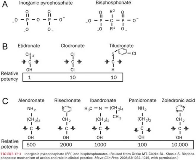 Bisphosphonates are drugs with a phosphorus-carbon-phosphorus (P-C-P) chemical structure that resemble inorganic pyrophosphate (Fig. 17-3).43 Inorganic pyrophosphate is involved in regulation of bone mineralization by binding hydroxyapatite crystals, inhibiting calcification. The phosphate groups of bisphosphonates, like inorganic pyrophosphate, bind hydroxyapatite crystals and become incorporated into sites of active bone remodeling, thus inhibiting calcification. The hydroxyl group attached to the central carbon further increases bisphosphonate’s ability to bind calcium, and the final structural grouping is attached to the central carbon to determine the bisphosphonate’s potency for inhibition of bone resorption. First-generation bisphosphonates (etidronate, clodronate, tiludronate), similar to inorganic pyrophosphate, become incorporated into adenosine triphosphate (ATP) by class II aminoacyl-transfer RNA synthetases after osteoclast-mediated uptake from bone and mineral surface. This abnormal ATP cannot be hydrolyzed, accumulates, and is believed to be cytotoxic to osteoclasts. Second- and third-generation bisphosphonates (alendronate, risedronate, ibandronate, pamidronate, and zoledronic acid) contain nitrogen or amino groups in this position, which increases the antiresorptive potency by binding and inhibiting farnesyl pyrophosphate synthase, leading to osteoclast apoptosis. Second- and third-generation bisphosphonate–induced osteoclast apoptosis can be detected by a reduction in biochemical markers of bone resorption; maximum suppression occurs within 3 months of initiation of oral therapy. Suppression is noted to be more rapid following IV administration. Duration of effect is a function of potency for mineral matrix binding, with zolendronic acid suppressing biochemical markers of bone resorption for up to 1 year in women with postmenopausal osteoporosis.