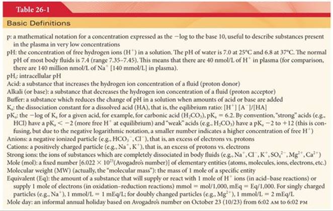The management of acid–base disorders requires establishing the cause(s) of the disorder and then treating the underlying physiologic derangement. The treatment of acid–base disturbances is complex for a variety of reasons including the fact that the laboratory information on which we make decisions is rarely complete. This is because we often do not have access to all the data which influence a patient’s acid–base status (e.g., serum phosphate, sulfate, etc.). The acid–base disturbance is often evolving rapidly (e.g., ischemia, shock, etc.) and there is a delay getting laboratory results. The algorithms which have been designed to help us understand acid–base therapy are based on steady-state conditions and the terminology that we use to describe acid–base chemistry is not intuitive (Table 26-1). However, with just blood gas and common serum biochemistry data, we can manage the majority of clinical acid–base disorders.