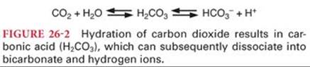 The bicarbonate buffering system consists of carbonic acid (H2CO3) and sodium bicarbonate (NaHCO3). Bicarbonate buffer is primarily a product of the approximately 200 mL of carbon dioxide produced per minute, of which considerably less than 1% dissolves to become carbonic acid. Carbonic acid is a weak acid because of its limited degree of dissociation (<5% at physiologic pH) into hydrogen and bicarbonate ions (Fig. 26-2). Most carbonic acid in solution almost immediately dissociates into carbon dioxide and water, the net result being a very high concentration of dissolved carbon dioxide compared to the concentration of bicarbonate ions. This relationship is described mathematically by the Henderson-Hasselbalch equation, which can be used to calculate the pH of a solution if the concentration of bicarbonate ions and dissolved carbon dioxide is known (Fig. 26-3).