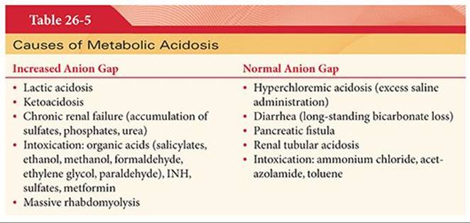 Metabolic acidosis is most often associated with an increase in the anion gap (Table 26-5). An increase in the concentration of unmeasured anions (or a decrease in the concentration of unmeasured cations) will increase the anion gap. Lactic acidosis, ketoacidosis, and renal failure increase the concentration of unmeasured endogenous anions. Exogenous anions will also increase the concentration of unmeasured anions (salicylate toxicity, ethylene glycol, and methanol ingestion). Hyperchloremic acidosis and renal tubular acidosis (bicarbonate loss) will have a normal anion gap. The weaknesses of the anion gap concept include that it does not differentiate between the causes of increased anion gap metabolic acidosis; it does not correct for pH changes due to free-water volume increase or decreases; and it does not correct for changes in serum albumin and phosphate, which have an effect on acid–base balance.