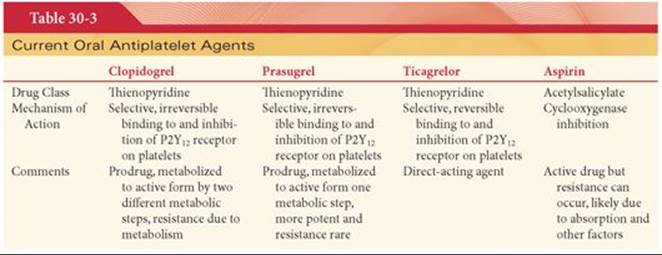 Dual antiplatelet therapy—a thienopyridine (ADP P2Y12 receptor antagonist) coadministered with aspirin— is commonly used for improving clinical outcomes in patients with acute coronary syndrome and undergoing percutaneous intervention. New agents include prasugrel and ticagrelor. Ticagrelor is a reversible, direct-acting P2Y12 receptor antagonist. The P2Y12 is a Gi-coupled platelet receptor for ADP that plays a central role in platelet function. Drugs that inhibit P2Y12 are potent antithrombotic drugs. Clopidogrel is the most widely used agent, but resistance, as defined as its inability to inhibit adequately P2Y12-dependent platelet function, occurs in 20% to 30% of patients. Prasugrel and ticagrelor appear to be more effective than clopidogrel in preventing thrombosis, although they increase the incidence of major bleeding, a problem with the efficacy of all anticoagulants.