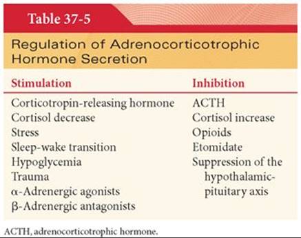 ACTH regulates secretions of the adrenal cortex, especially cortisol, and stimulates the formation of cholesterol in the adrenal cortex. Cholesterol is the initial building block for the synthesis of corticosteroids. Secretion of ACTH responds dramatically to stress under the control of corticotropin-releasing hormone from the hypothalamus, as well as a negative feedback mechanism from the circulating plasma concentration of cortisol (Table 37-5).3 Secretory rates of corticotropin-releasing hormone and ACTH are high in the morning and low in the evening. This diurnal variation results in high plasma cortisol concentrations in the morning (~20 µg/dL) and low levels (~5 µg/dL) around midnight. For this reason, plasma concentrations of cortisol are interpreted in terms of the time of day of the measurement. Surgical incision, reversal of anesthesia, and postoperative pain stimulate ACTH release.1,4,5