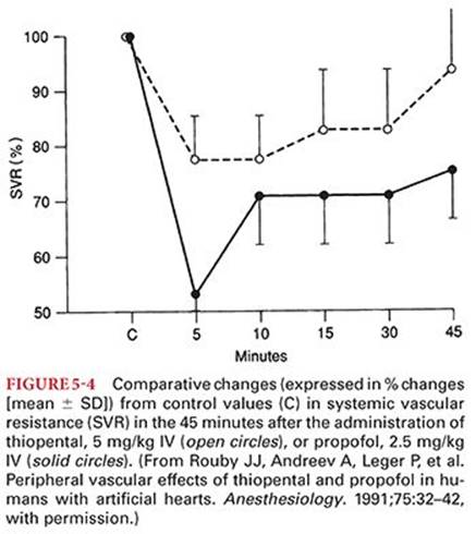 Propofol produces decreases in systemic blood pressure, which are greater than those evoked by comparable doses of thiopental (Fig. 5-4).49 These decreases in blood pressure are often accompanied by corresponding changes in cardiac output and systemic vascular resistance. The relaxation of vascular smooth muscle produced by propofol is primarily due to inhibition of sympathetic vasoconstrictor nerve activity.50 A negative inotropic effect of propofol may result from a decrease in intracellular calcium availability secondary to inhibition of trans-sarcolemmal calcium influx. Stimulation produced by direct laryngoscopy and intubation of the trachea reverses the blood pressure effects of propofol. Propofol also effectively blunts the hypertensive response to placement of a laryngeal mask airway. The impact of propofol on desflurane-mediated sympathetic nervous system activation is unclear. In one report, propofol 2 mg/kg IV blunted the increase in epinephrine concentration, which accompanied a sudden increase in the delivered desflurane concentration but did not attenuate the transient cardiovascular response.51 Conversely, in another report, induction of anesthesia with propofol, but not etomidate, blunted the sympathetic nervous system activation and systemic hypertension associated with the introduction of rapidly increasing inhaled concentrations of desflurane.52 The blood pressure effects of propofol may be exaggerated in hypovolemic patients, elderly patients, and patients with compromised left ventricular function. Adequate hydration before rapid IV administration of propofol is recommended to minimize the blood pressure reduction.