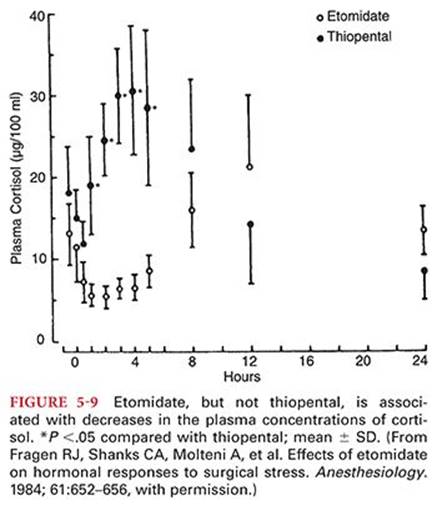 The principal limiting factor in the clinical use of etomidate for induction of anesthesia is the ability of this drug to transiently depress adrenocortical function (see the section “Adrenocortical Suppression”). It is widely viewed that postoperative nausea and vomiting is increased in patients receiving etomidate for induction of anesthesia.108 Nevertheless, comparison of etomidate with propofol did not document an increased incidence of nausea and vomiting in the first 24 hours after surgery in patients receiving etomidate.109