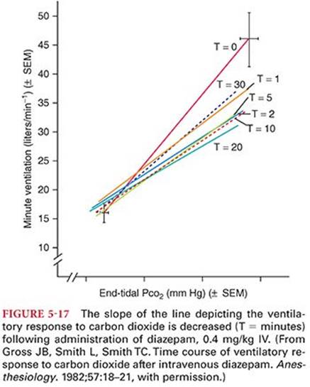 Propofol produces dose-dependent depression of ventilation, with apnea occurring in 25% to 35% of patients after induction of anesthesia with propofol.65 Opioids administered with the preoperative medication enhances ventilatory depressant. Painful surgical stimulation is likely to counteract the ventilatory depressant effects of propofol. A maintenance infusion of propofol decreases tidal volume and frequency of breathing. The ventilatory response to arterial hypoxemia are also decreased by propofol due to an effect at the central chemoreceptors.66 Likewise, propofol at sedative doses significantly decreases the slope and causes a downward shift of the ventilatory response curve to hypoxia.67 Hypoxic pulmonary vasoconstriction seems to remain intact in patients receiving propofol.
