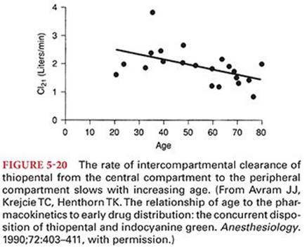 Despite the rapid clearance of propofol by metabolism, there is no evidence of impaired elimination in patients with cirrhosis of the liver. Plasma concentrations of propofol at the time of awakening are similar in alcoholic and normal patients.19 Extrahepatic elimination of propofol occurs during the anhepatic phase of orthotopic liver transplantation. Renal dysfunction does not influence the clearance of propofol despite the observation that nearly three-fourths of propofol metabolites are eliminated in urine in the first 24 hours.20 Patients older than 60 years of age exhibit a decreased rate of plasma clearance of propofol compared with younger adults. The rapid clearance of propofol confirms this drug can be administered as a continuous infusion during surgery without an excessive cumulative effect. Propofol readily crosses the placenta but is rapidly cleared from the neonatal circulation.21 The effect of instituting cardiopulmonary bypass on the plasma propofol concentration is unpredictable, with some studies reporting a decrease, whereas other observations fail to document any change.22