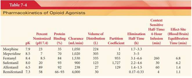 Morphine is well absorbed after IM administration, with onset of effect in 15 to 30 minutes and a peak effect in 45 to 90 minutes. The clinical duration of action is about 4 hours. Morphine can be administered orally for treatment of chronic pain recognizing that absorption from the gastrointestinal is limited by significant first-pass metabolism in the liver, which limits the bioavailability of an orally administered dose to approximately 25% (1 mg of IV morphine ~4 mg of oral morphine). Morphine is usually administered IV in the perioperative period, thus eliminating the unpredictable influence of drug absorption. The peak effect (equilibration time between the blood and brain) after IV administration of morphine is delayed compared with opioids such as fentanyl and alfentanil, requiring about 15 to 30 minutes (Table 7-4). Morphine inhaled as an aerosol from a nebulizer may act on afferent nerve pathways in the airways to relieve dyspnea as associated with lung cancer and associated pleural effusion.50 However, profound depression of ventilation may follow aerosol administration of morphine.51 The onset and duration of the analgesic effects of morphine are similar after IV administration or inhalation via a pulmonary drug delivery system that produces a fine aerosol.52
