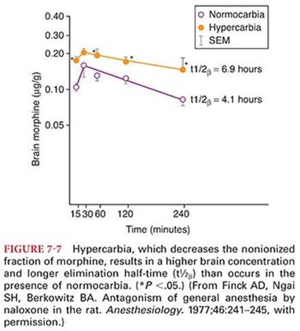 Only a small amount of administered morphine gains access to the CNS. For example, it is estimated that less than 0.1% of morphine that is administered IV has entered the CNS at the time of peak plasma concentrations. Reasons for poor penetration of morphine into the CNS include (a) relatively poor lipid solubility, (b) high degree of ionization at physiologic pH, (c) protein binding, and (d) rapid conjugation with glucuronic acid. Alkalinization of the blood, as produced by hyperventilation of the patient’s lungs, will increase the nonionized fraction of morphine and thus enhance its passage into the CNS. Nevertheless, respiratory acidosis, which decreases the nonionized fraction of morphine, results in higher plasma and brain concentrations of morphine than are present during normocarbia (Fig. 7-7).55 This suggests that carbon dioxide–induced increases in cerebral blood flow and enhanced delivery of morphine to the brain are more important than the fraction of drug that exists in either the ionized or nonionized fraction. In contrast to the CNS, morphine accumulates rapidly in the kidneys, liver, and skeletal muscles. Morphine, unlike fentanyl, does not undergo significant first-pass uptake into the lungs.56
