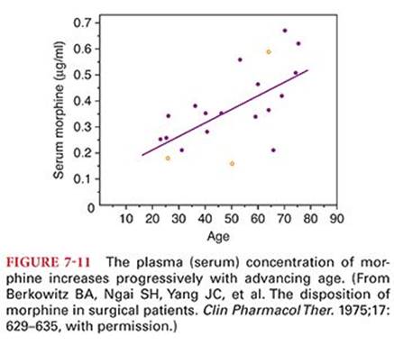 After IV administration of morphine, the elimination of morphine-3-glucuronide is somewhat longer than for morphine (see Table 7-4 and Fig. 7-8).53 The decrease in the plasma concentration of morphine after initial distribution of the drug is principally due to metabolism because only a small amount of unchanged opioid is excreted in the urine. Plasma morphine concentrations are higher in the elderly than in young adults (Fig. 7-11).54 In the first 4 days of life, the clearance of morphine is decreased and its elimination half-time is prolonged compared with that found in older infants.64 This is consistent with the observation that neonates are more sensitive than older children to the respiratory depressant effects of morphine. Patients with renal failure exhibit higher plasma and CSF concentrations of morphine and morphine metabolites than do normal patients, reflecting a smaller volume of distribution (Vd).65Possible accumulation of morphine-6-glucuronide suggests the need for caution when administering morphine to patients with renal dysfunction. Concentrations of morphine in the colostrum of parturients receiving patient-controlled analgesia with morphine are low and it is unlikely that significant amounts of drug will be transferred to the breast-fed neonate.66