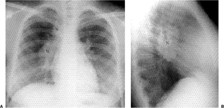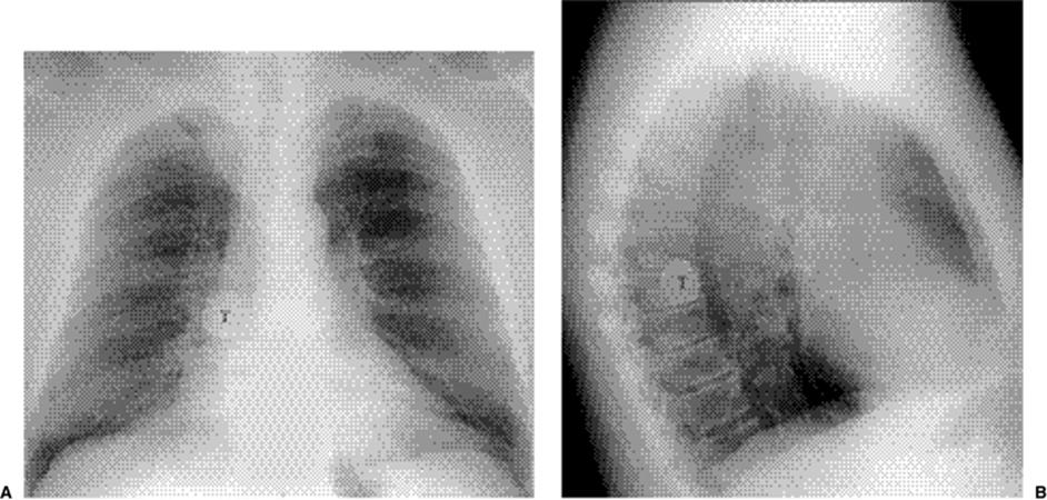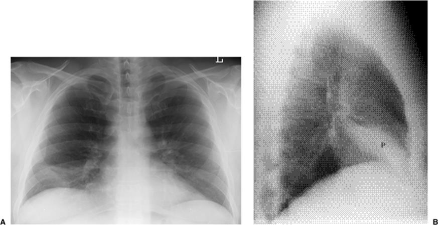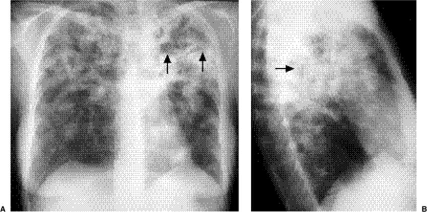 Figure 5.42 Chronic histoplasmosis. (A) Posteroanterior and (B) lateral chest radiographs: abnormality indistinguishable from postprimary tuberculosis and classic nontuberculous mycobacteria. |