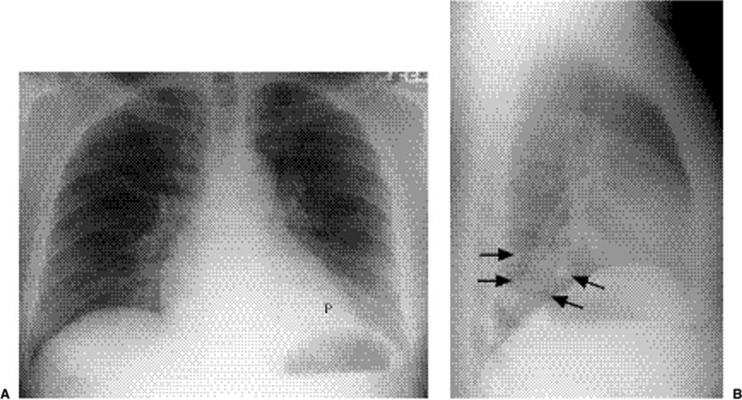 Figure 5.2 Opacity in pneumonia. (A) Posteroanterior and (B) lateral chest radiographs: vague retrocardiac abnormality (P) with corresponding increased opacity over the lower thoracic spine on the lateral view (arrows). |
