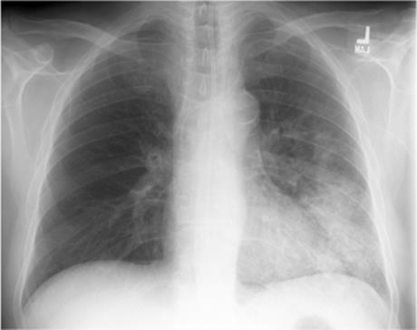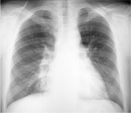 Figure 5.4 Silhouette sign of lingular pneumonia. Partial loss of visualization of lower left heart border. |