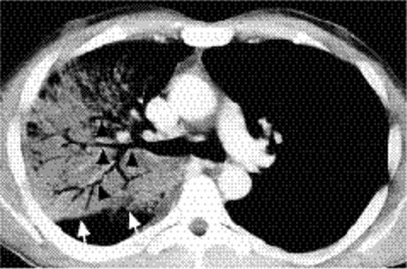 Figure 5.5 Airspace disease at computed tomography. Pneumonia shows air bronchograms (arrowheads), lobar distribution (arrowsdenote major fissure), and ill-definition anteriorly. |