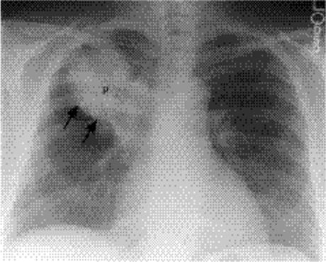 Figure 5.11 Round pneumonia (P), demonstrating a sharp margin inferiorly (arrows) and an ill-defined border superomedially. |