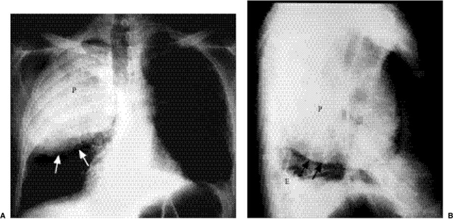 Figure 5.12 Pneumonia (P) enlarging the right upper lobe, suggesting the correct diagnosis of Klebsiella pneumonia. (A)Posteroanterior and (B) lateral chest radiographs: note bowing of major fissure (arrows). There is an associated pleural effusion (E). |