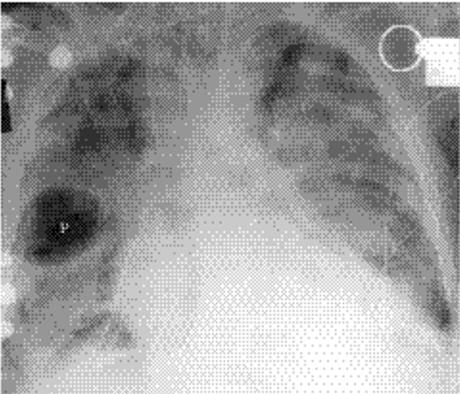 Figure 5.15 Diffuse pneumonia with pneumatocele formation (P). |