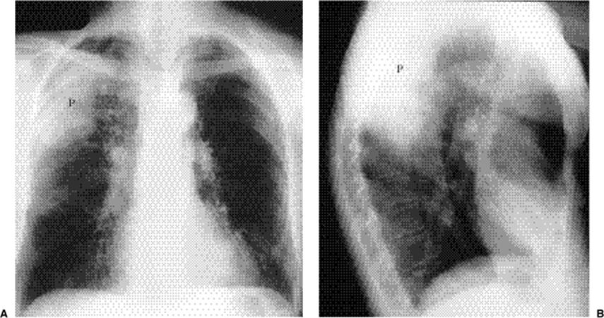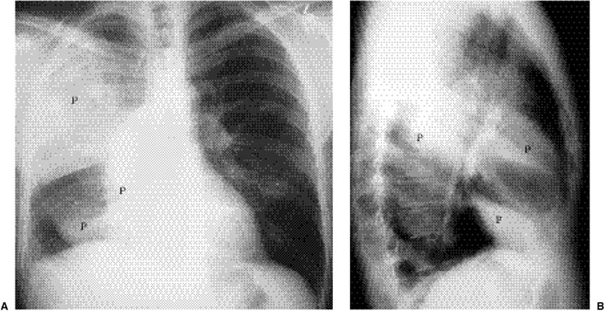 Figure 5.9 Lobar pneumonia. (A) Posteroanterior and (B) lateral chest radiographs demonstrate opacification of virtually the entire middle lobe (P). |