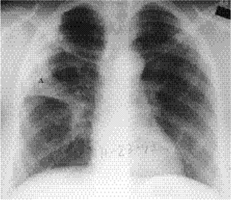 Figure 5.41 Miliary histoplasmosis. Miliary nodules are best visualized in the lower lungs. They were new from a chest x-ray 2 months earlier and resolved without therapy 4 months later. At that time, the patient died of Addison disease, and autopsy confirmed disseminated histoplasmosis as the cause. |