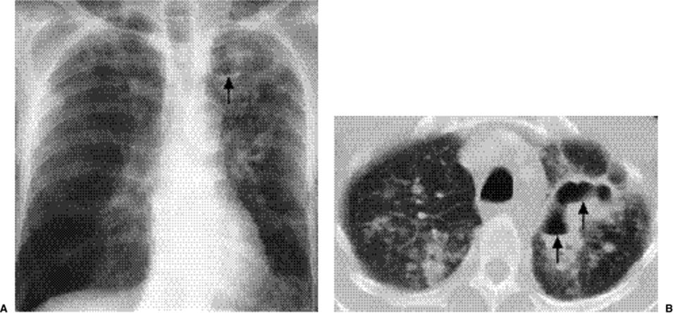 Allergic bronchopulmonary aspergillosis occurs in patients with longstanding asthma (35). It is an allergic response to inhaled spores, with types I and III hypersensitivity reactions. Aspergillus organisms proliferate in the airway lumen, providing a supply of antigen. Immediate hypersensitivity reaction mediated by IgE occurs. IgG is also produced, and antigen–antibody immune complexes are deposited in the bronchial mucosa. Bronchial wall necrosis and dilation occur with eosinophilic infiltrates. Excess mucous production and abnormal ciliary function lead to mucous impaction. Expectoration of mucous plugs containing aspergillus organisms and eosinophils occurs. Symptoms include wheeze, cough, sputum production, chest pain, and low-grade fever.