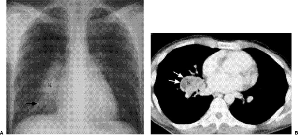 Figure 5.47 Coccidioidomycosis. (A) Posteroanterior and (B) lateral chest radiographs demonstrate bilateral hilar lymph node enlargement (N). |