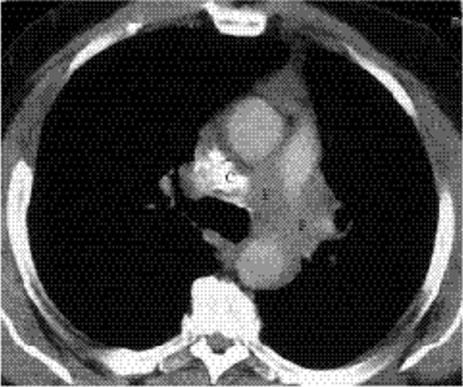Figure 5.44 Fibrosing mediastinitis. Computed tomography reveals calcified lymph nodes (C) and noncalcified infiltrating soft tissue (F). |