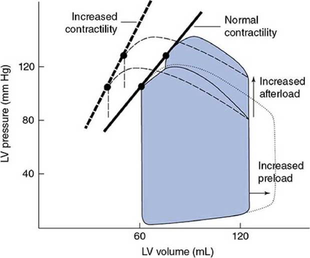 However, the end-systolic pressure-volume relationship can be used to assess cardiac contractility. End-systolic volume for a given cardiac cycle is estimated by one of the imaging techniques described above, whereas end-systolic pressure for that cardiac cycle can be obtained from the arterial pressure recorded at the point of closure of the aortic valve (the incisura). Values for several different cardiac cycles may be obtained during infusion of a vasoconstrictor (which increases afterload), and the data plotted as in Figure 4-1 in the context of overall ventricular pressurevolume loops. As shown, increases in myocardial contractility are associated with a leftward rotation in the end-systolic pressure-volume relationship. Decreases in contractility (as may be caused by heart disease) are associated with a downward shift of the line, discussed further in Chapter 11. This method of assessing cardiac function is particularly important because it provides an estimate of contractility that is independent of the end-diastolic volume (preload). (Recall from Figure 34 and from the pressure-volume loop described by the dotted line in Figure 4-1 that increases in preload cause increases in stroke volume without changing the end-systolic volume. Thus, only alterations in contractility will cause shifts in the end-systolic pressure-volume relationship.)