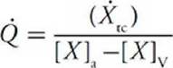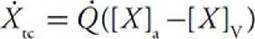 Fick principle : The most accurate (but unfortunately somewhat invasive) way of measuring how much blood is actually pumped by the heart per minute is by the use of the Fick principle described in Chapter 1. Recall that the amount of a substance consumed by an organ or tissues, X tc, is equal to what goes in minus what goes out, which is the arterial- venous concentration difference in the substance ([ X] a-[ X] v) times the blood flow rate,![]()