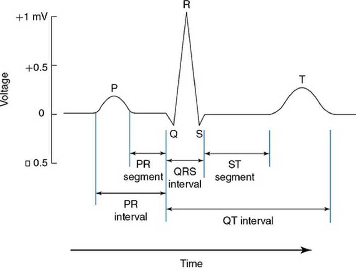 ● States the relationship between electrical events of cardiac excitation and the P, QRS, and T waves, the PR and QT intervals, and the ST segment of the electrocardiogram.