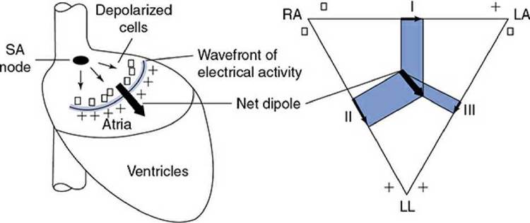 The magnitude and direction of the net dipole formed by the wavefront of the action potential at any instant in time can be deduced from the magnitude and orientation of the electrocardiographic deflections.