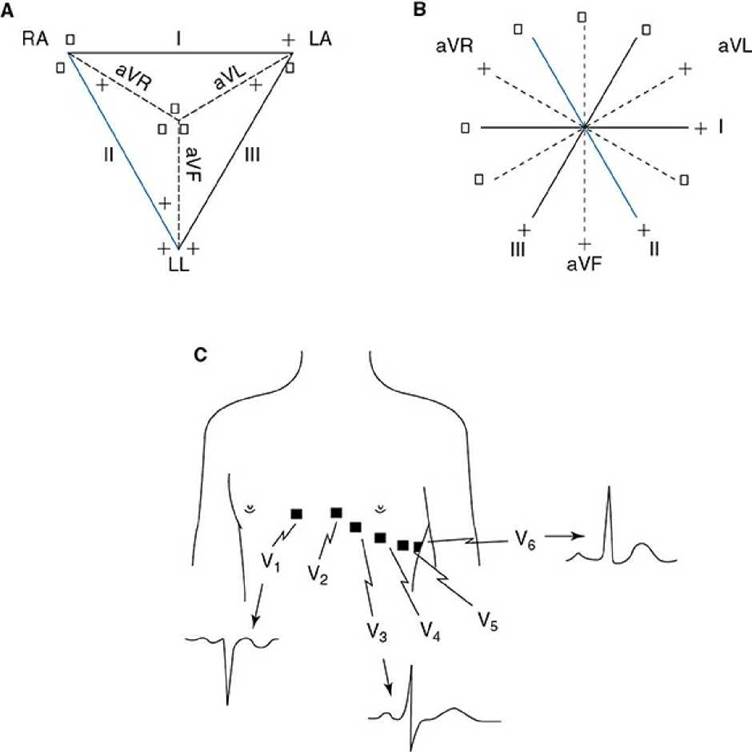 Figure 4-8. The standard 12-lead electrocardiogram. ( A and B) Leads in the frontal plane. ( C) Electrode positions for precordial leads in the transverse plane.