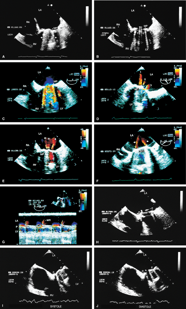 FIGURE 5.1. St. Jude mitral prosthesis: normal. The mitral prosthesis (MP) is seen in the closed (A) and open (B) positions. A. Prosthetic reverberations or artifacts (arrows) that clutter the left ventricle (LV). B. The two leaflets (1 and 2) of the prosthesis in the open position together with the reverberations. C. Aliased diastolic inflow into the LV is seen with a small region of flow acceleration. D–G. Two to three small jets of mitral regurgitation (MR; arrows) are shown. These are normal findings. Usually, these jets are narrow and do not show significant turbulence but may extend deep into the left atrium (LA). G. illustrates the norm (not pansystolic). H. Small linear echoes are normally seen on both the atrial and ventricular aspects of the prosthesis and represent suture material. I, J. Immediately postsurgery, although the patient is still on partial bypass, one leaflet of the prosthesis (P) may intermittently fail to open. This should not be mistaken for dysfunction. When cardiac output improves, normal opening of both leaflets occurs consistently. RV, right ventricle; RA, right atrium. |
