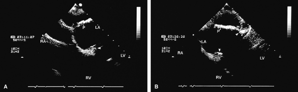 FIGURE 5.4. A,B. St. Jude mitral prosthesis: ectopic position. In this patient, the St. Jude prosthesis (P) is attached to the wall of the left atrium (LA) (upper arrowhead in B) rather than to the valve ring (lower arrowheads). LV, left ventricle; RA, right atrium; RV, right ventricle. |