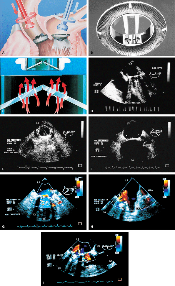 FIGURE 5.5. CarboMedics mitral prosthesis: normal. A–C. Schematics of the CarboMedics mitral prosthesis. In A, the CarboMedics aortic prosthesis is also shown. C. The mechanism of normally occurring MR through the hinge points (courtesy of Sulzer CarboMedics Inc., Austin, TX). D. The prosthesis is seen in the four-chamber view, demonstrating multiple reverberations (1, 2, 3, 4) partially obscuring the left ventricle (LV) and right ventricle (RV) cavities. E. Both leaflets of the prosthesis and the suture ring (arrow) are viewed in the short axis. F. Individual sutures (arrowheads) are seen on the atrial aspect of the prosthetic valve. G. Diastolic flow acceleration (arrowhead) on the atrial aspect of the prosthesis. The LV inflow jet is large. H,I. Two small jets of normal prosthetic valvular regurgitation (arrowheads). R, prosthetic reverberations. AO, aorta; AV, aortic valve; LA, left atrium; LAA, left atrial appendage; MPA, main pulmonary artery; PA, pulmonary artery; RA, right atrium; VS, ventricular septum. |