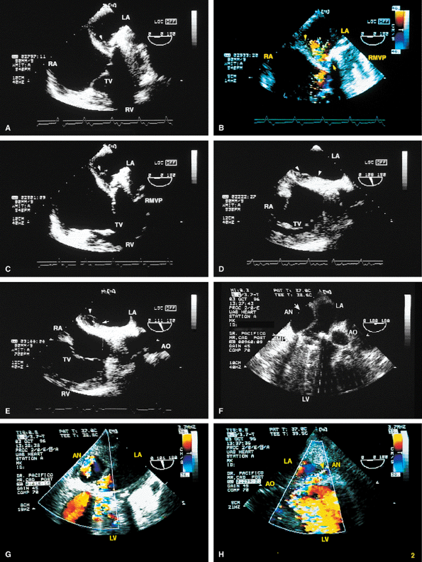 FIGURE 5.6. A–E. CarboMedics mitral prosthesis: dehiscence of left atrium (LA) wall. A. A small linear echo (vertical arrow) at the site of the paravalvular defect (horizontal arrow) consistent with suture material. B. Color Doppler examination shows a large paravalvular regurgitant jet originating at the site of the paravalvular defect (arrow) shown in A. C. An abnormal 1-cm linear echo (arrow) protrudes into the LA at the midinteratrial septal level. D,E. Multiplane views at 105° and 111° demonstrate a cavitary defect (arrows) involving the LA wall at the midinteratrial septal level, indicative of dehiscence, which explains the presence of the linear echo in the LA seen in C. F–H. CarboMedics mitral prosthesis (MP): LA pseudoaneurysm. F. A large pseudoaneurysm (AN; arrow) that developed following prosthetic replacement (MP, arrowhead) of the mitral valve.G,H. Color Doppler examination shows flow signals (arrowhead in H) moving from the left ventricle (LV) into the aneurysm cavity. AO, aorta; RA, right atrium; RMVP, reverberations from mitral valve prosthesis. (A–E reproduced with permission from Howard J, Agrawal G, Nanda NC. Transesophageal echocardiographic diagnosis of left atrial wall dehiscence. Echocardiography 1997;14:299–302. ) |