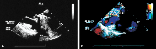 FIGURE 5.8. Bjork-Shiley mitral prosthesis: suture dehiscence. The arrow in A shows a large area of dehiscence with severe paraprosthetic (P) MR (arrow in B). LA, left atrium; LV, left ventricle; RA, right atrium; RV, right ventricle. |