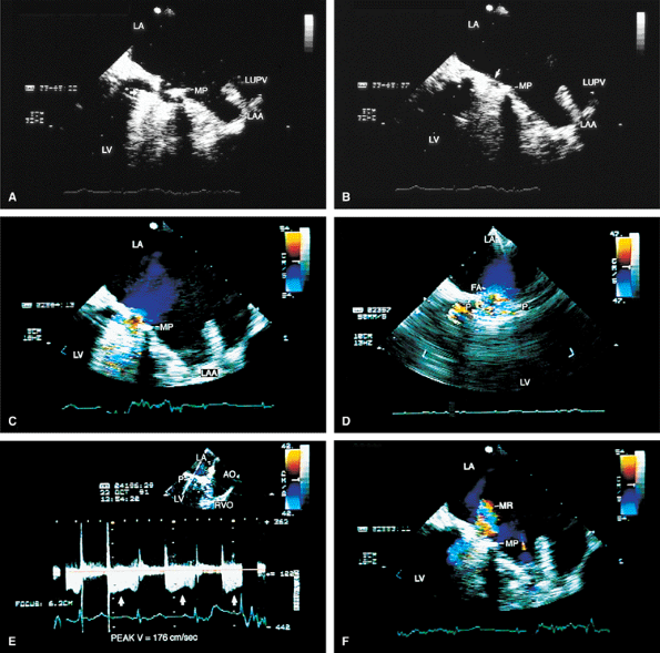 FIGURE 5.9. Cooley-Cutter mitral prosthesis: stenosis. A. Prosthetic reverberations (arrow). B. A questionable thrombus (arrow). C,D. Prominent flow acceleration (FA) is present on the atrial aspect of the prosthesis (MP, P). E. A high velocity of 176 cm/sec was measured across the prosthesis by continuous wave Doppler (arrows). F. Associated mild mitral regurgitation (MR). AO, aorta; LA, left atrium; LAA, left atrial appendage; LUPV, left upper pulmonary vein; LV, left ventricle; MP, mitral prosthesis; MR, mitral regurgitation; RVO, right ventricular outflow tract. |
