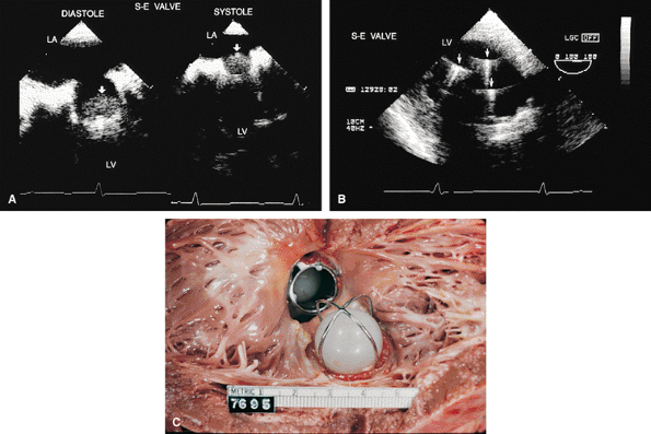 FIGURE 5.10. Starr-Edwards prosthesis: normal. A. The rounded poppet (arrows) is seen in the open position in diastole and in the closed position in systole. B. Transgastric view shows the three prosthetic struts (arrows) together with the resulting reverberations imaged in short axis. C. Gross specimen shows Starr-Edwards prostheses in the aortic and mitral positions. LA, left atrium; LV, left ventricle. |