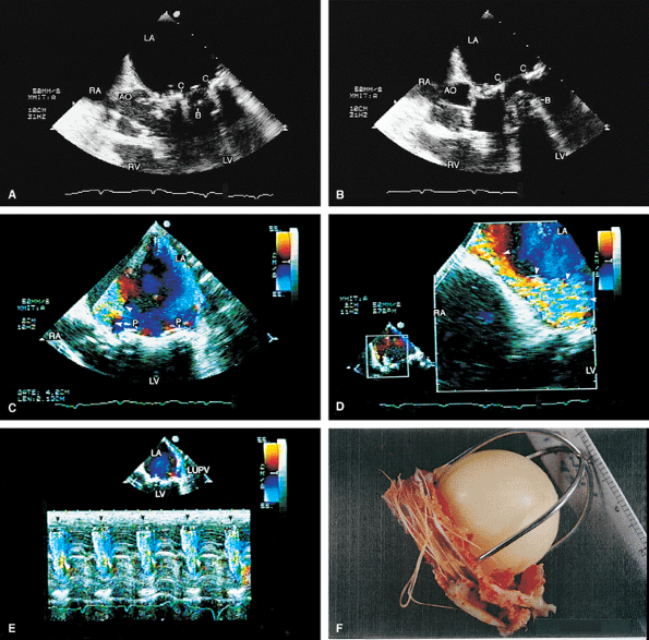 FIGURE 5.11. Starr-Edwards mitral prosthesis: dehiscence. The poppet, or ball (B), is seen in the closed (A) and open (B) positions. Note the reverberations from the ball partially obscuring the left ventricle (LV) in B. C,D. Eccentric, severe paravalvular mitral regurgitation (arrowheads) originating beyond the prosthetic (P) elements is shown. E.Color M-mode examination demonstrates systolic backflow (arrowheads) in the left upper pulmonary vein (LUPV), confirming the presence of severe MR. C, C, mitral ring. F. Gross specimen shows suture dehiscence and clot involving a Starr-Edwards prosthesis. AO, aorta; LA, left atrium; RA, right atrium; RV, right ventricle. |